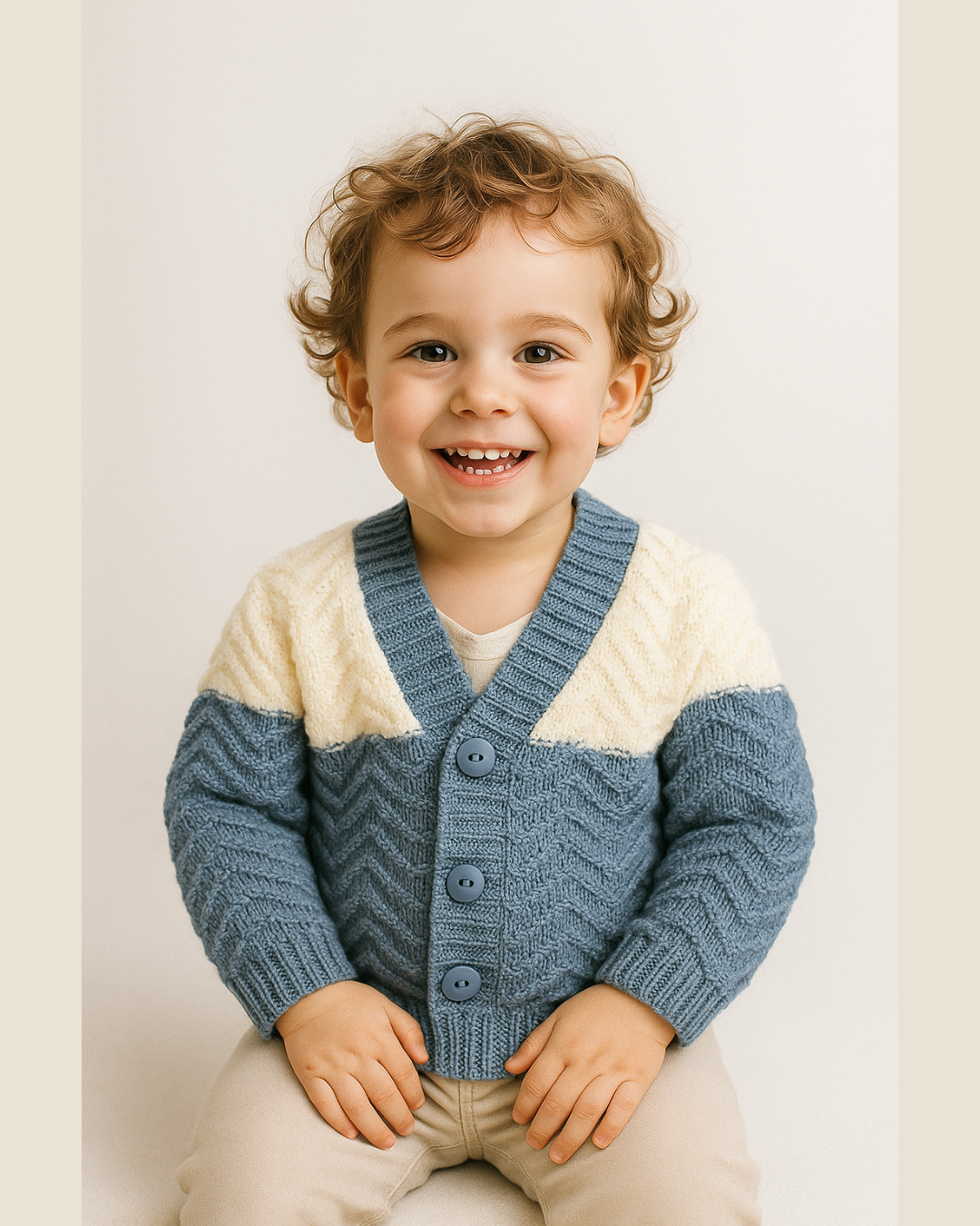 Casaco infantil em tricô da marca Pitti Bimbo, confeccionado em lã 100% acrílica, garantindo toque macio, quentinho e muito confortável. Possui gola V, fechamento frontal com botões e padronagem em zigue-zague, que confere charme e sofisticação à peça.