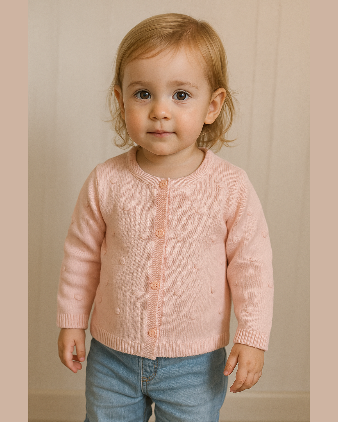 Casaco infantil feminino confeccionado em tricô 100% acrílico, com toque macio, ideal para manter a criança aquecida com conforto e delicadeza. Possui gola redonda e fechamento frontal por botões. O grande destaque da peça está no efeito decorativo em bolinhas no próprio tricô, que adiciona charme e um toque diferenciado ao visual. Perfeito para compor looks de inverno com elegância e leveza.