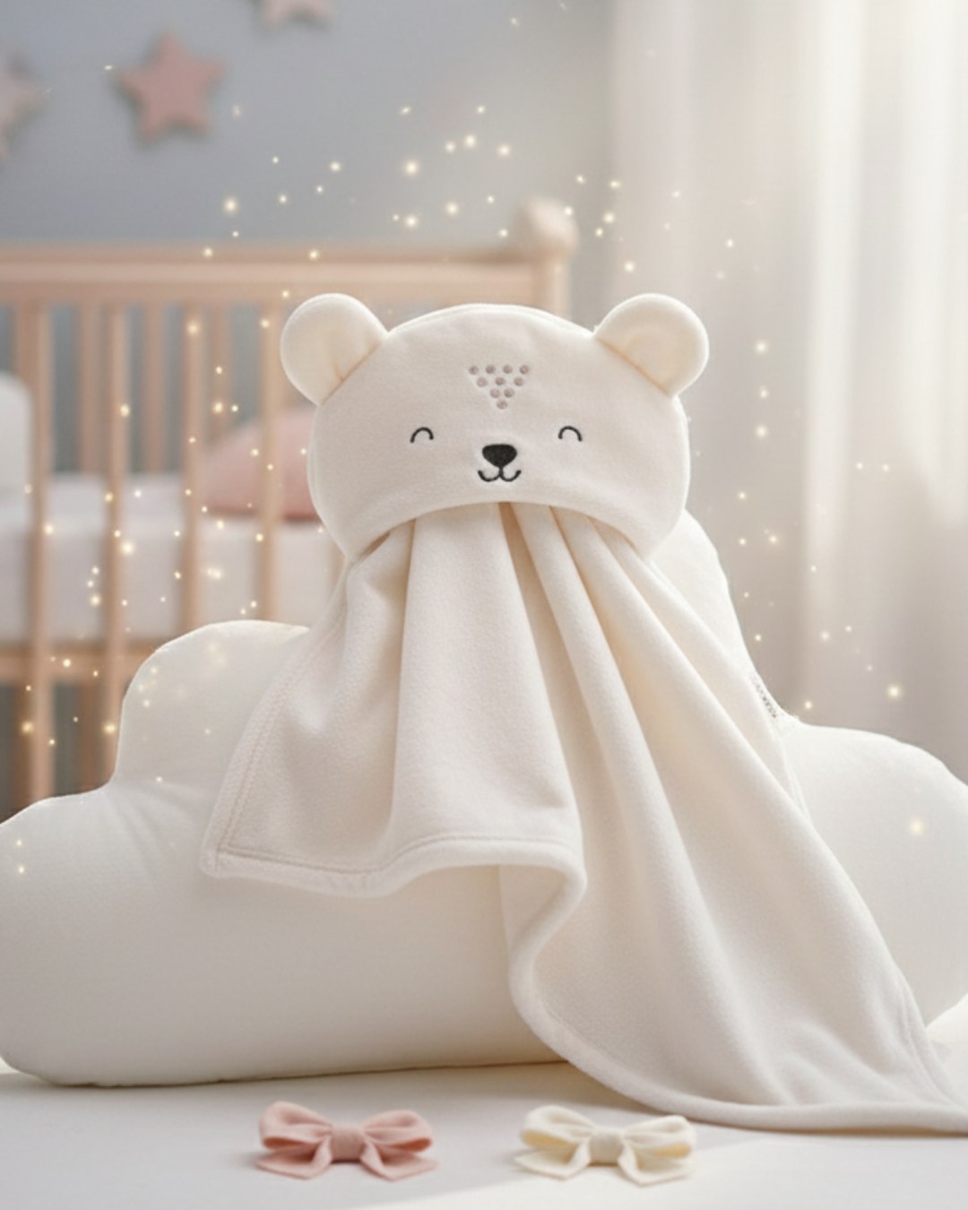 Cobertor de microfibra para bebê com capuz bordado em formato de bichinho e orelhinhas fofas. Extremamente macio e quentinho, protege a cabeça e envolve o bebê com conforto. Ideal para tornar cada momento mais aconchegante.