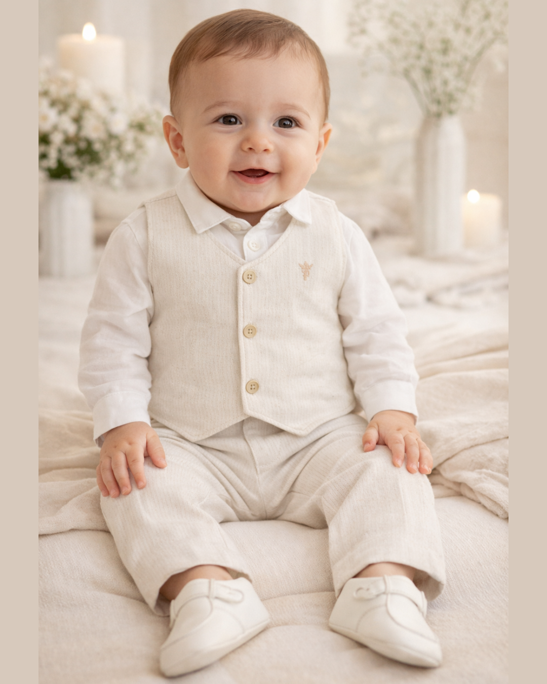 Composição do Look: Conjunto sofisticado de três peças coordenados, unindo elegância e bem-estar para batizados e eventos.
