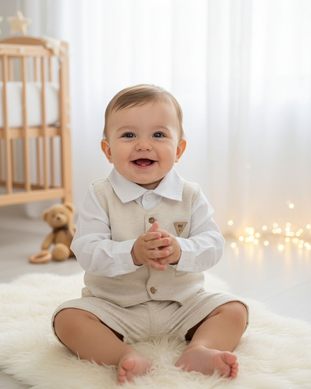 Conjunto bebê masculino da "Linha Cerimônia" para batizado, composto por camisa manga longa em cambraia leve, com mangas ajustáveis e abertura em botão, colete e shorts em tecido similar ao linho. O shorts possui cós elástico, abertura em botão de pressão e etiqueta personalizada da marca. Um look com caimento leve, estilo casual e toque sofisticado para ocasiões especiais.