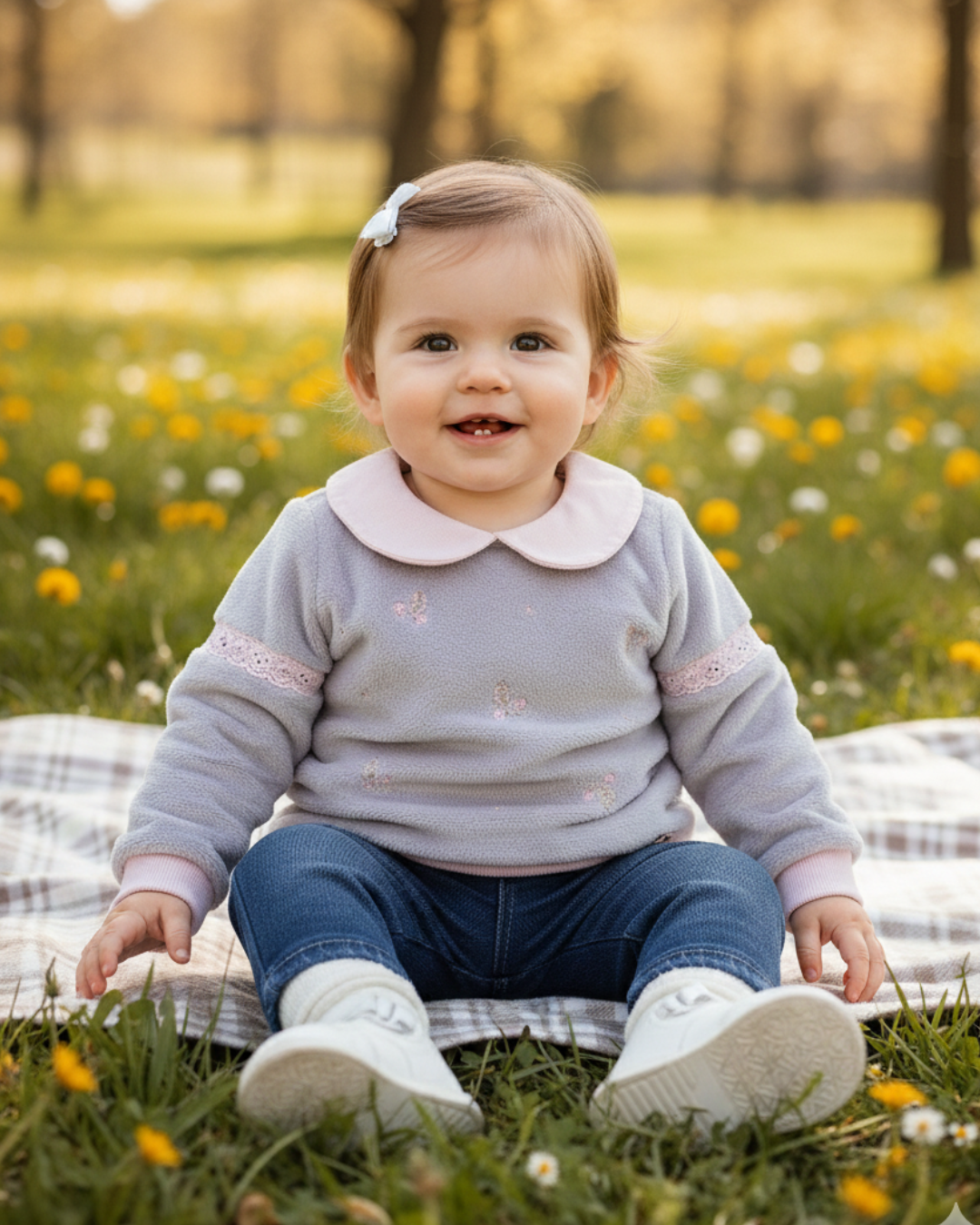 Conjunto bebê feminino encantador e confortável! A blusa em pelo macio possui detalhe bordado, plaquinha personalizada e abertura por botão de pressão nas costas para facilitar a troca. A calça jeans, com cós traseiro de elástico, garante ajuste perfeito e conforto para o dia a dia.