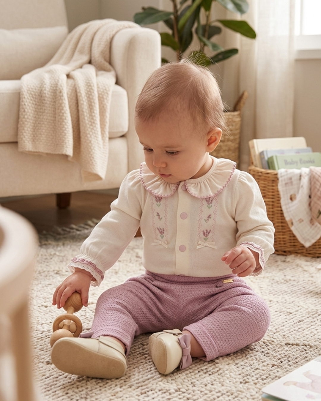 Conforto: Peças desenvolvidas com foco no bem-estar, apresentando caimento impecável e cós com elástico nas costas para ajuste suave ao corpo do bebê.