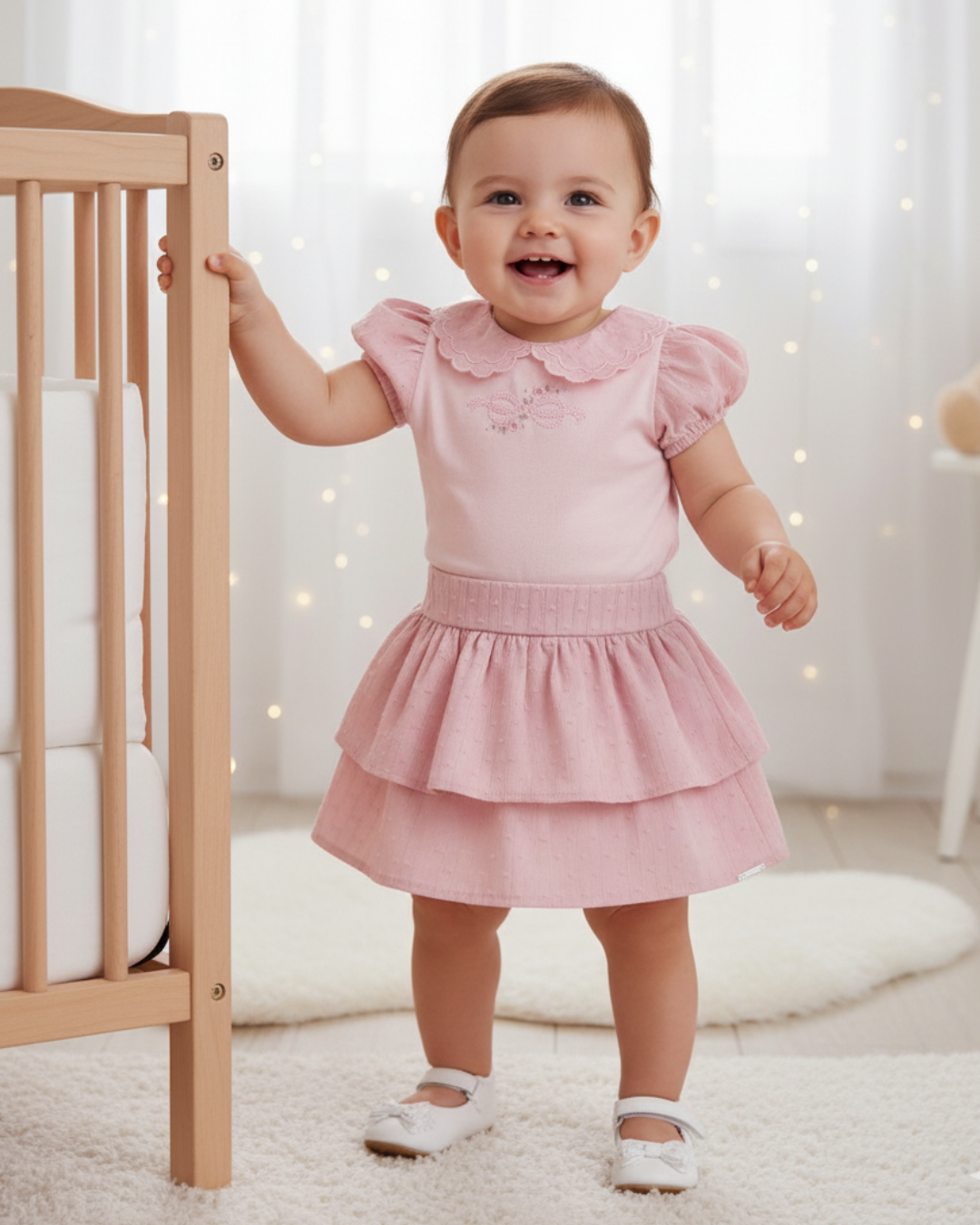 Conjunto bebê feminino composto por body meia manga em malha confortável, toque macio, mangas balonê e detalhes bordados, com abertura em botão de pressão. Acompanha saia em jacquard texturizado leve, fios de lurex e elástico na parte traseira, além de plaquinha personalizada da marca. Um look sofisticado e delicado, perfeito para ocasiões especiais.