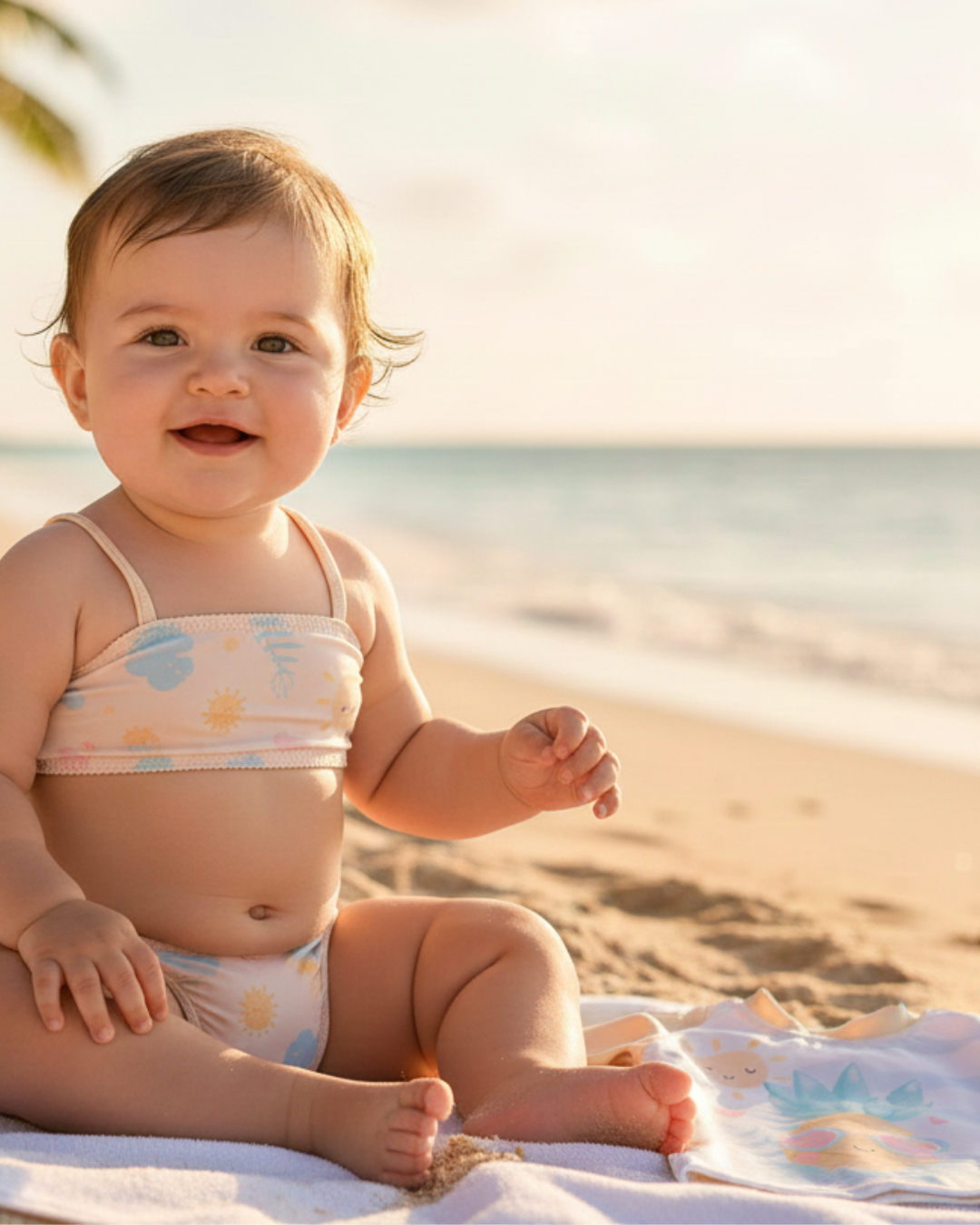 Conjunto bebê feminino da Linha Praia com blusa manga longa e blusinha de alça em malha Flip, e calcinha em malha Aquatic com cós e perninhas elásticas. Proteção UV 50+ para aproveitar o sol com segurança e estilo. Ideal para momentos na praia ou piscina, garantindo conforto e liberdade de movimentos.