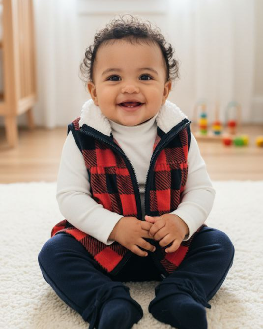 Detalhes: Colete xadrez com zíper e forro peluciado na gola, laços nas perninhas