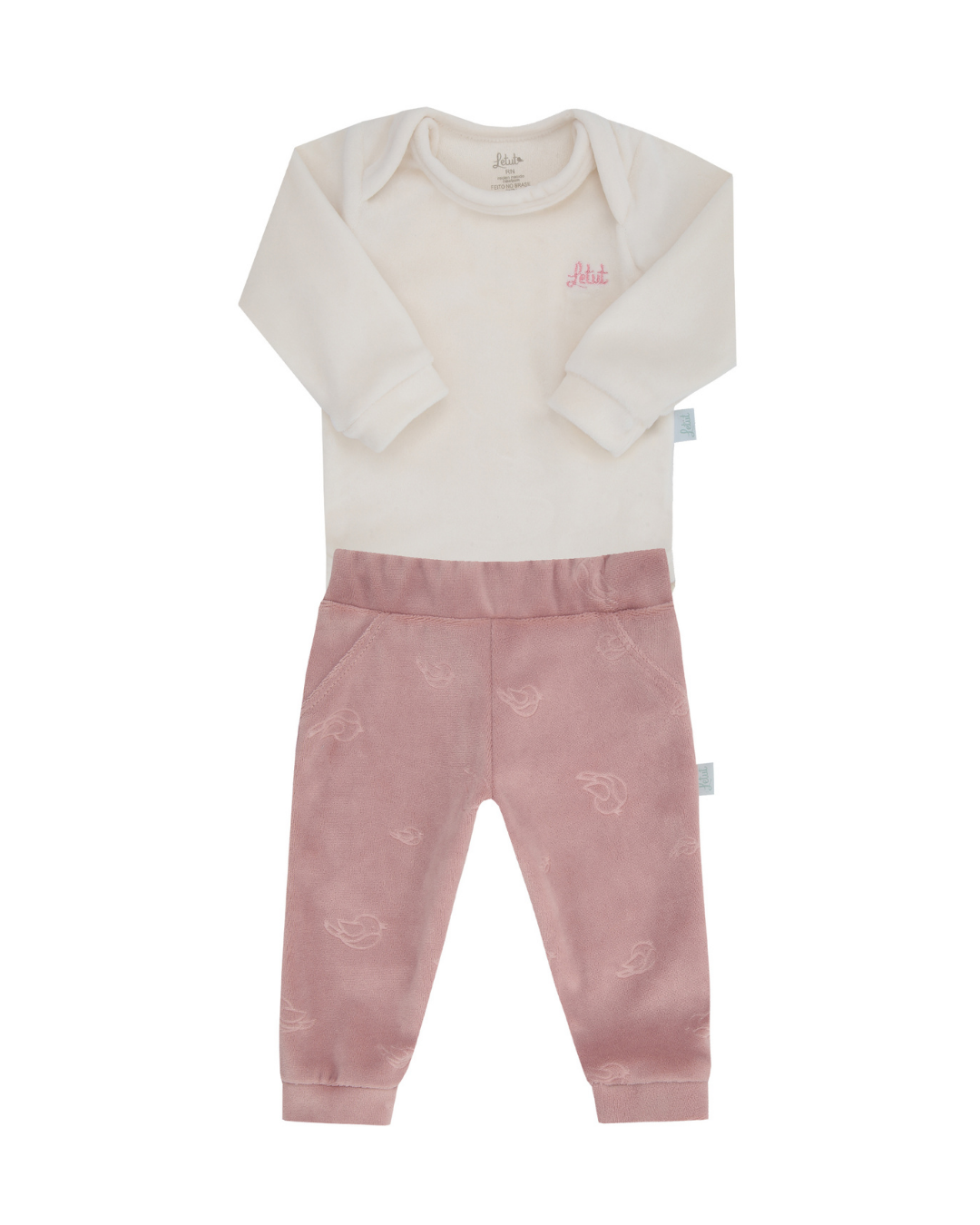 O Conjunto Longo Feminino da Letut oferece todo o conforto e aconchego que a bebê precisa nos dias frios. O body liso é confeccionado em plush super macio, com gola expansível que facilita a troca, abertura com botão de pressão no fundo e detalhe bordado delicado, garantindo charme e praticidade.