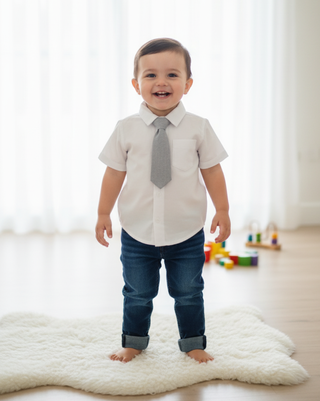 A gravata, em um tom de cinza discreto, é um acessório que complementa a camisa, adicionando um charme especial e um toque de sofisticação. Ela é fácil de usar e confere um ar de "mini-gentleman".