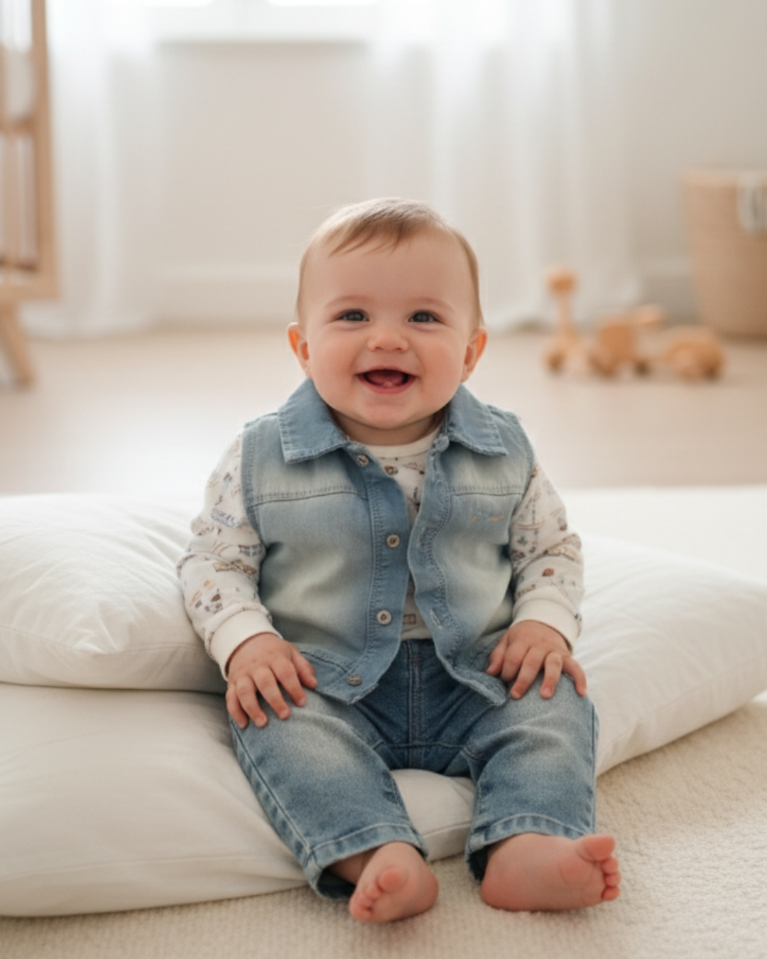 A calça e o colete em jeans macio têm toque suave e aparência moderna, garantindo conforto durante o uso e liberdade de movimento. O conjunto é perfeito para passeios e momentos especiais, unindo praticidade e estilo desde os primeiros meses.
