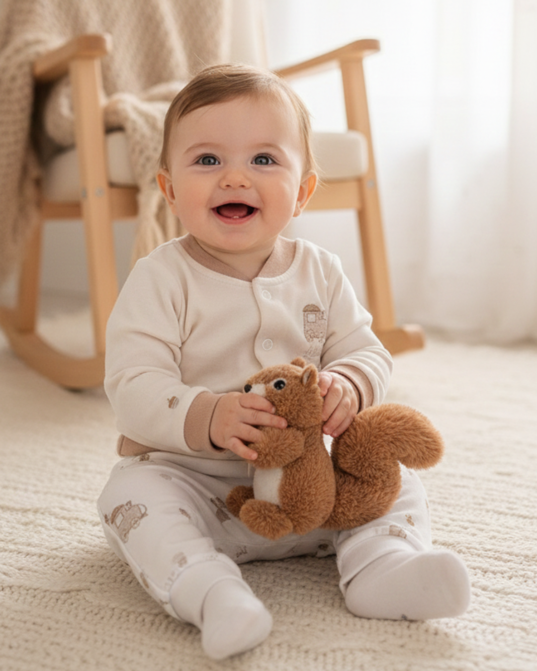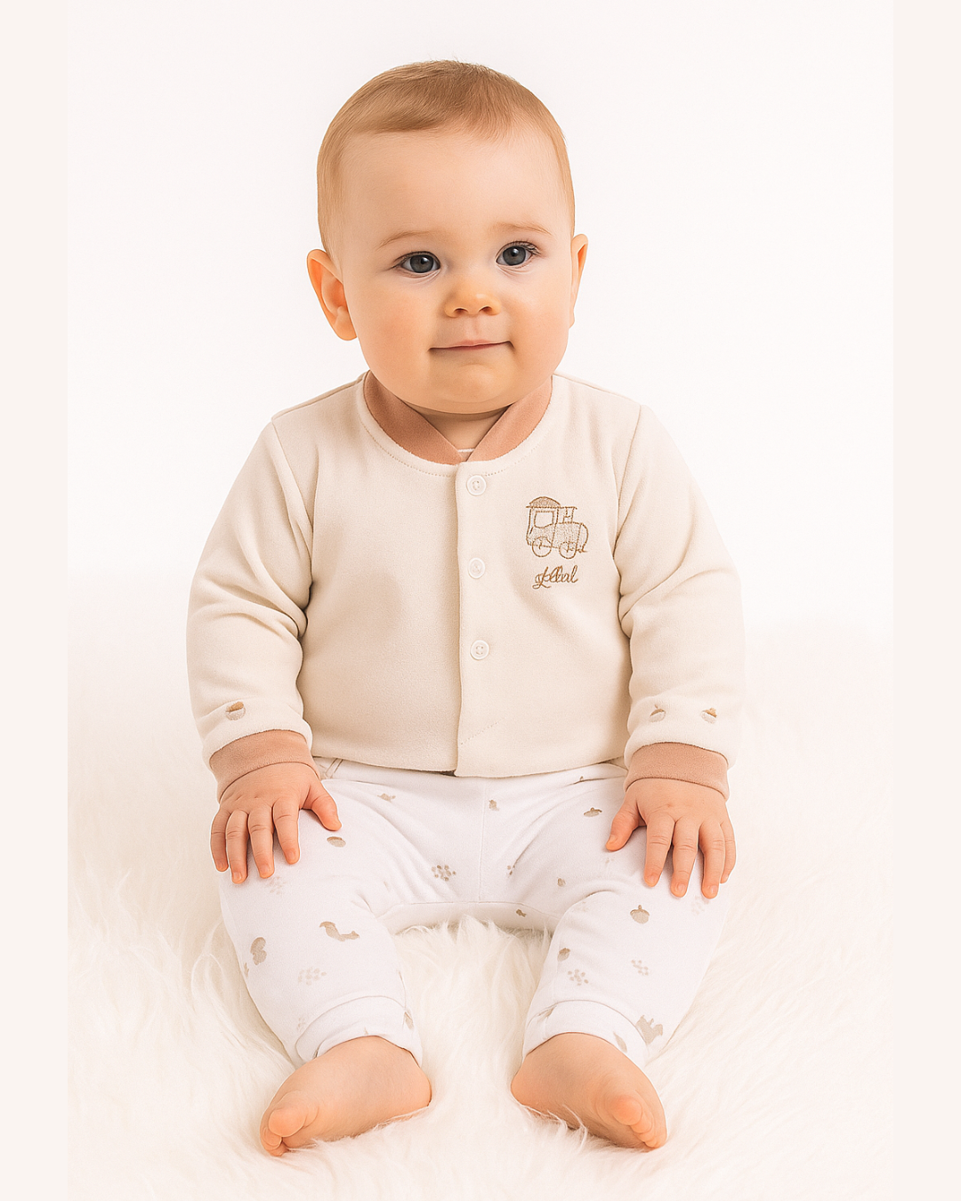 Conjunto bebê masculino longo confeccionado em plush macio e quentinho. O body possui gola com detalhes bordados e abertura prática entrepernas com botões de pressão, facilitando a troca do bebê. A calça é estampada, com cós elástico que proporciona conforto e liberdade de movimento. Uma opção delicada e funcional para os dias mais frescos.