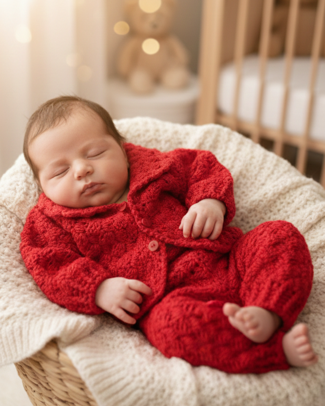 O casaco possui abertura frontal com botões, facilitando a troca do bebê, enquanto a calça sem pezinho conta com detalhe de passafita na cintura, proporcionando ajuste suave e seguro. Feito com lã 100% acrílica, é macio, quentinho e não pinica.