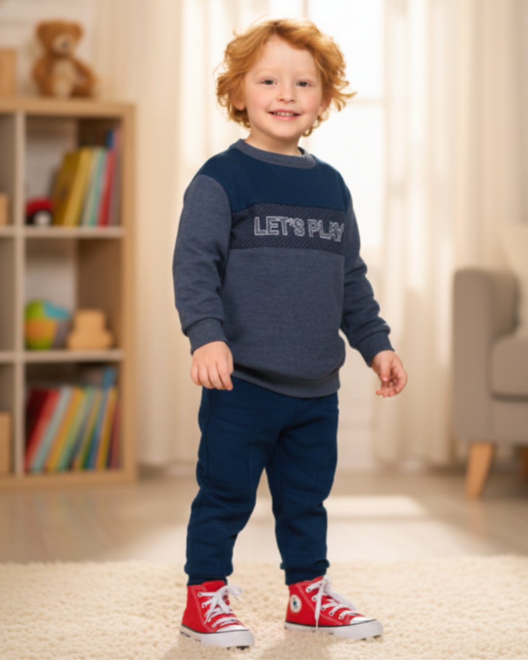 Conjunto infantil masculino composto por blusão e calça, ambos confeccionados em moletom penteado felpado, proporcionando aconchego e maciez. O blusão possui modelagem tradicional, ideal para dias mais frios. A calça conta com cós elástico para um ajuste confortável. Um conjunto perfeito para o dia a dia com muito estilo e conforto.