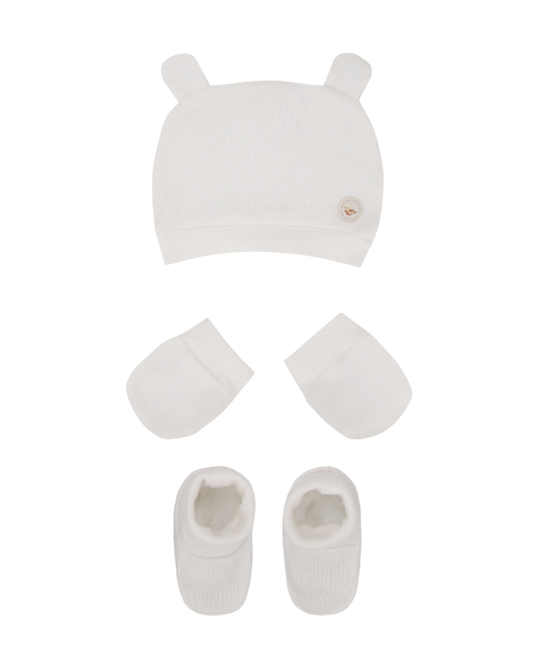 Conforto para Recém-Nascidos: Conjunto essencial de 3 peças (touca, luva e sapatinho) confeccionado em malha ribana dolly, conhecida pelo toque macio e flexível.