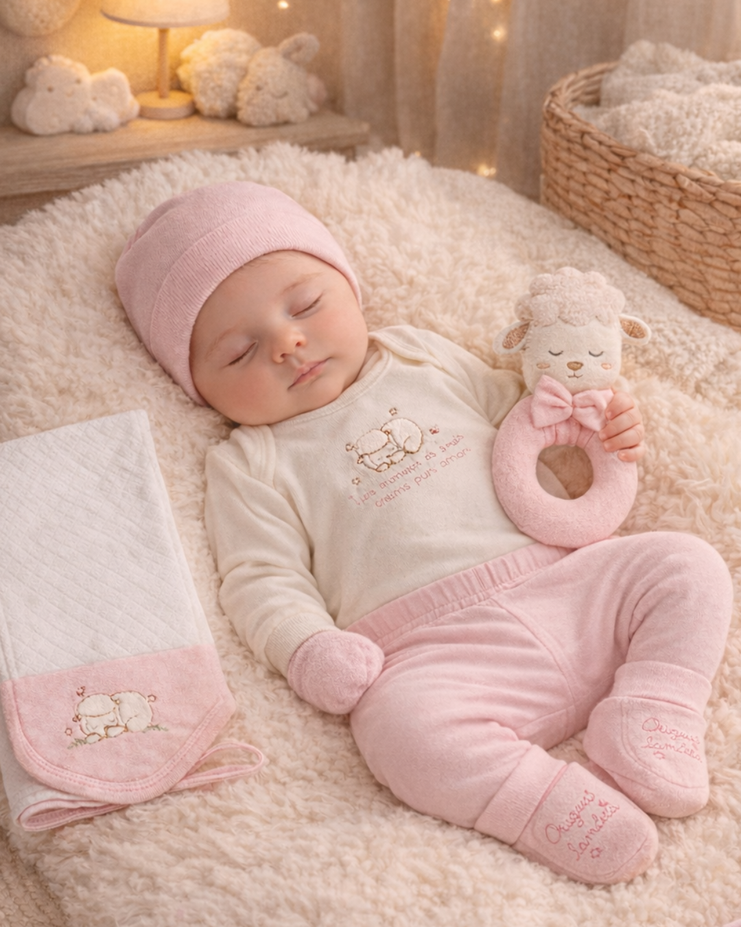 Composição do Kit: Um conjunto completo e essencial para os primeiros dias, composto por 7 peças coordenadas: body, calça, touca, luvas, sapatinhos, paninho de boca e uma argola de ovelhinha.