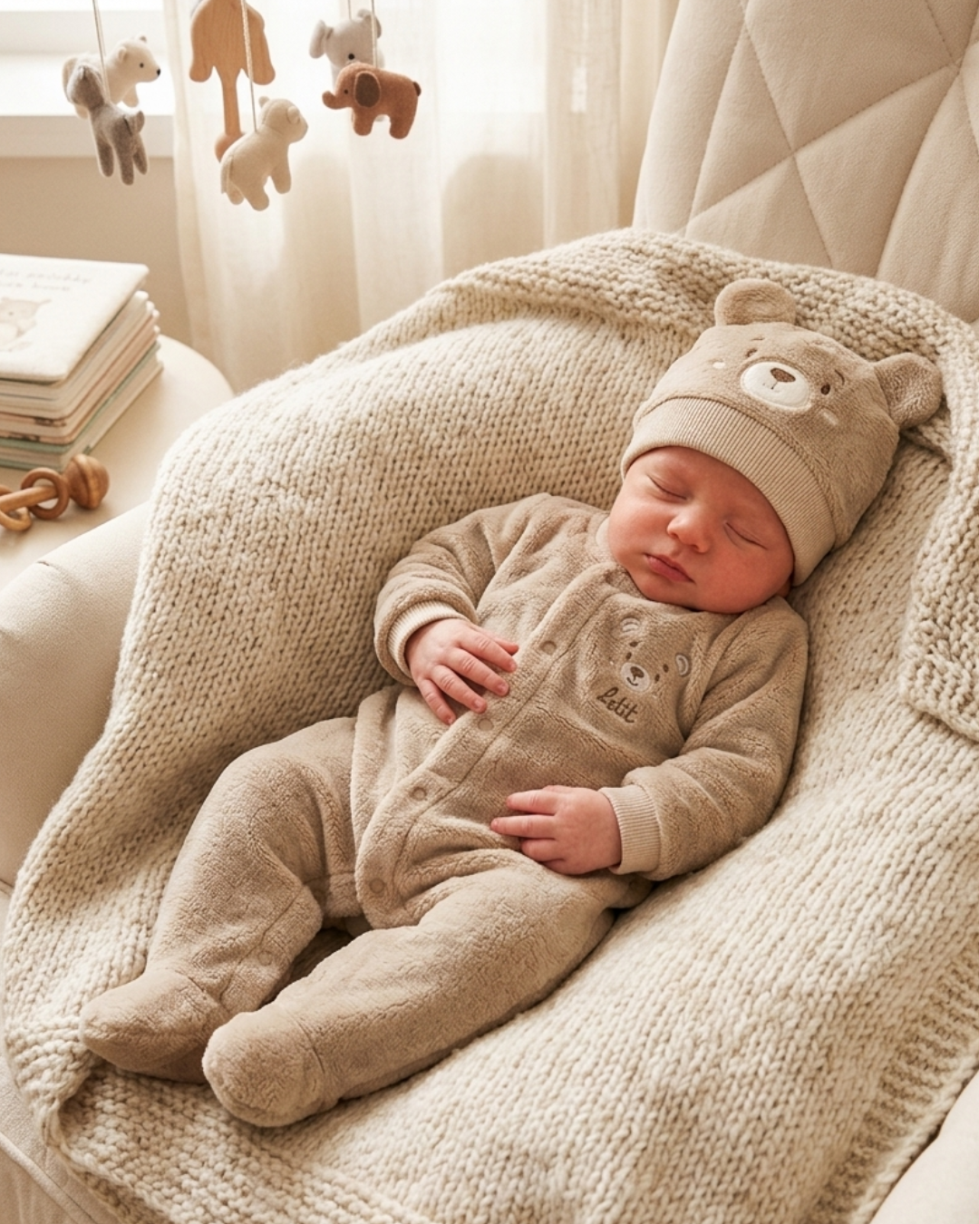 Touca Especial: Acompanha uma touca coordenada com orelhinhas aplicadas e rostinho bordado, completando o look com doçura e afeto.