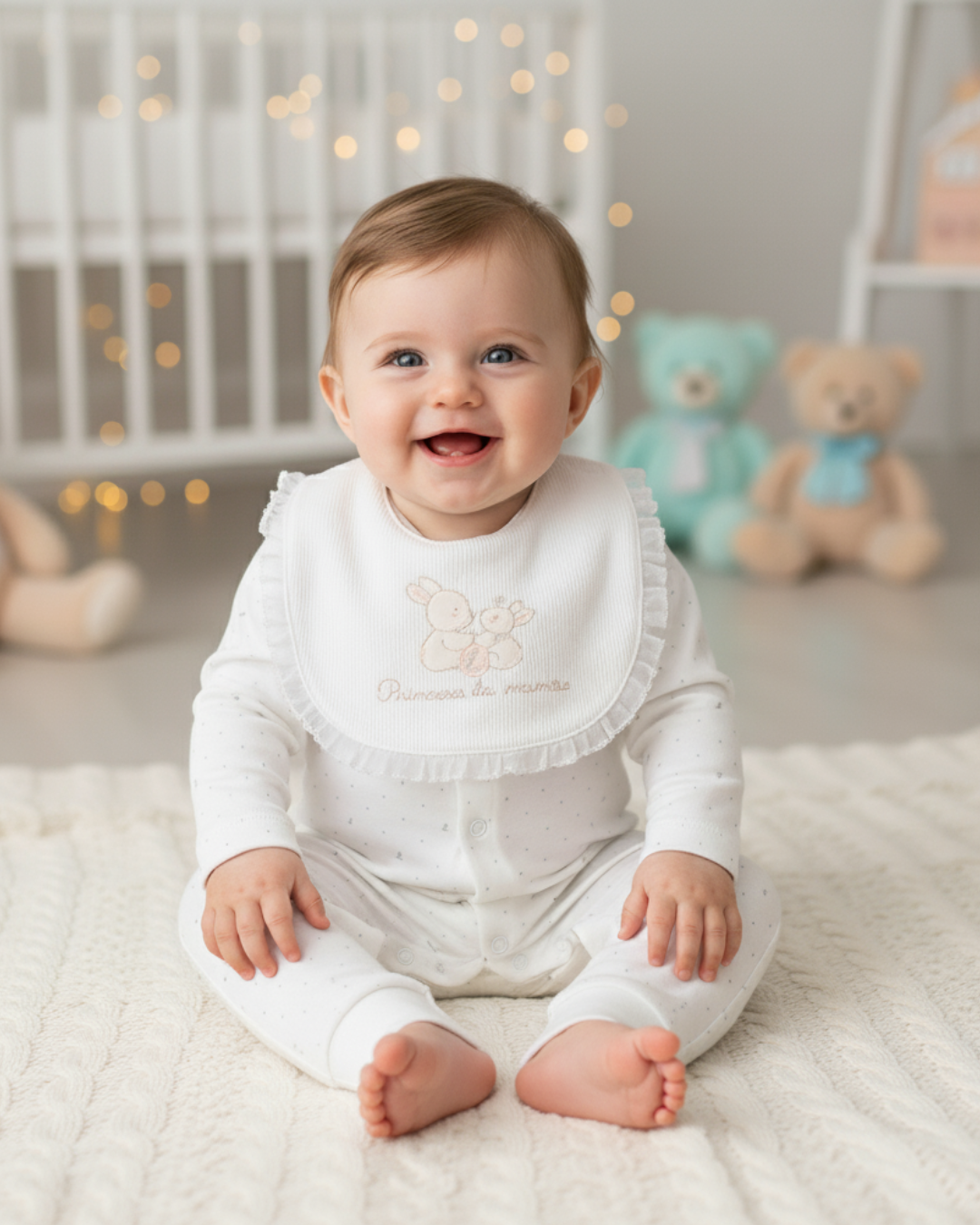 Acompanha babador removível em malha canelada, com bordado delicado “Princesa da Mamãe”, que adiciona um toque encantador e funcional à peça.