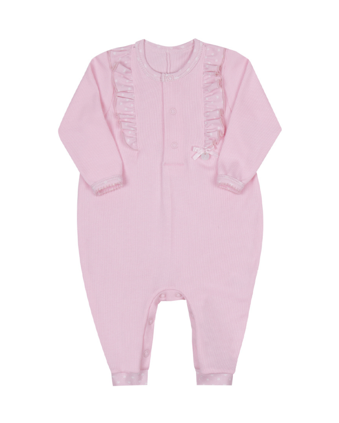 Macacão bebê feminino longo em malha canelada, macio e confortável, com detalhes estampados que trazem delicadeza ao look. Possui abertura gola polo e no fundo com botão de pressão, garantindo praticidade na troca.