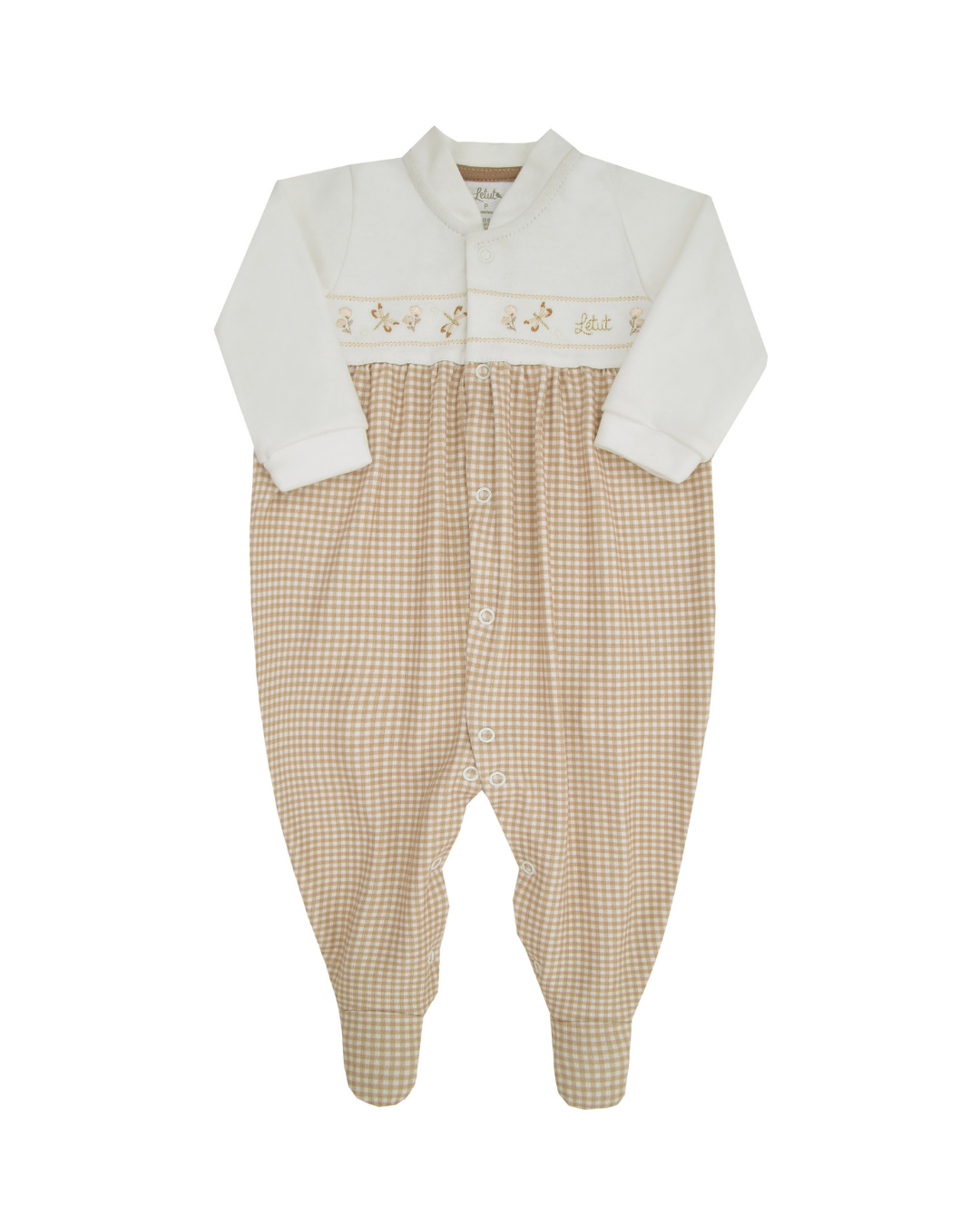 O Macacão Longo Feminino da Letut combina charme e conforto em um design moderno. Confeccionado em malha tricô com estampa vichy levíssima, possui toque suave e aveludado, garantindo bem-estar para a bebê.