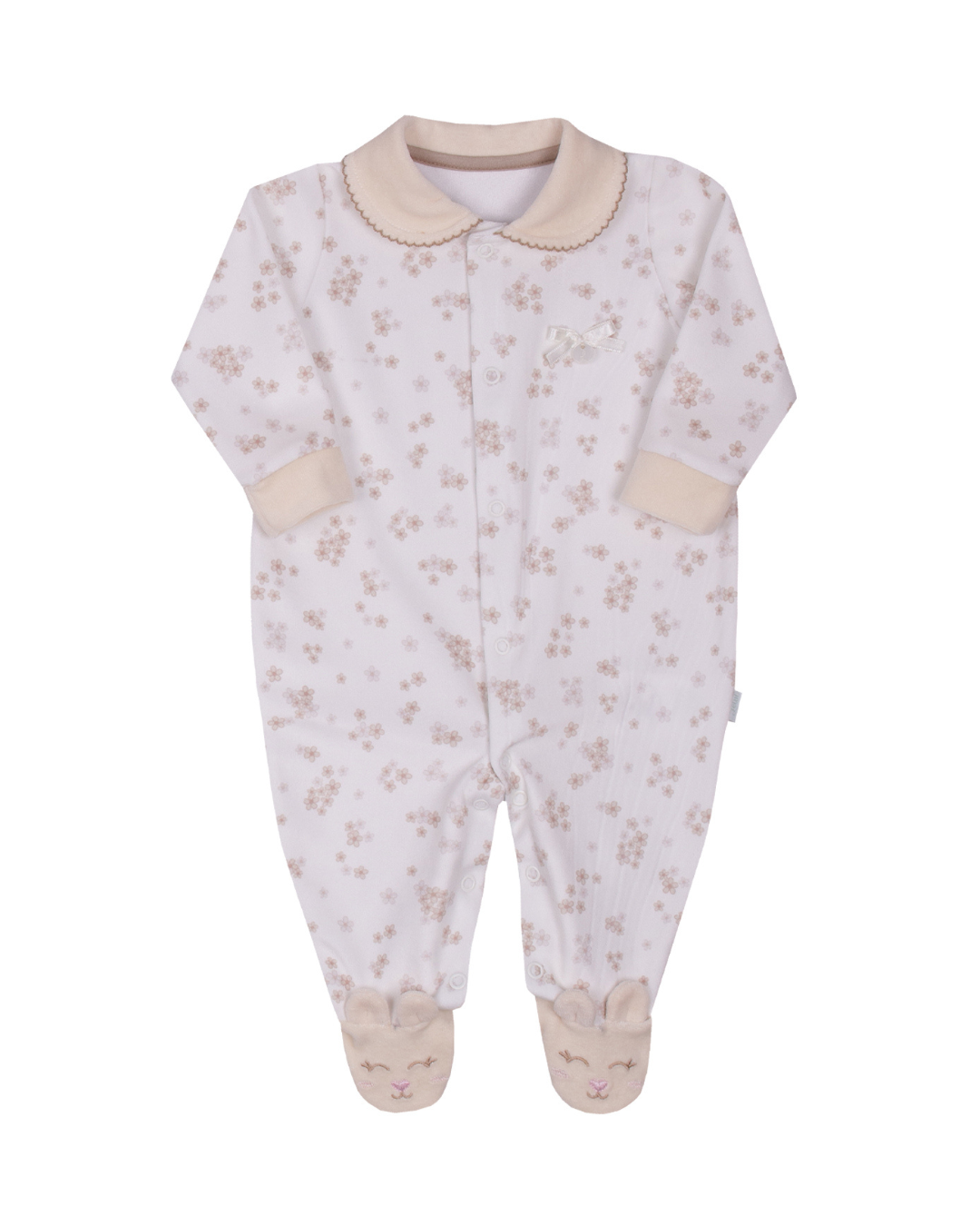 Macacão bebê feminino longo em plush estampado, macio e aconchegante. Possui detalhe bordado no pezinho e abertura em botão de pressão, proporcionando praticidade na troca e conforto para o bebê.