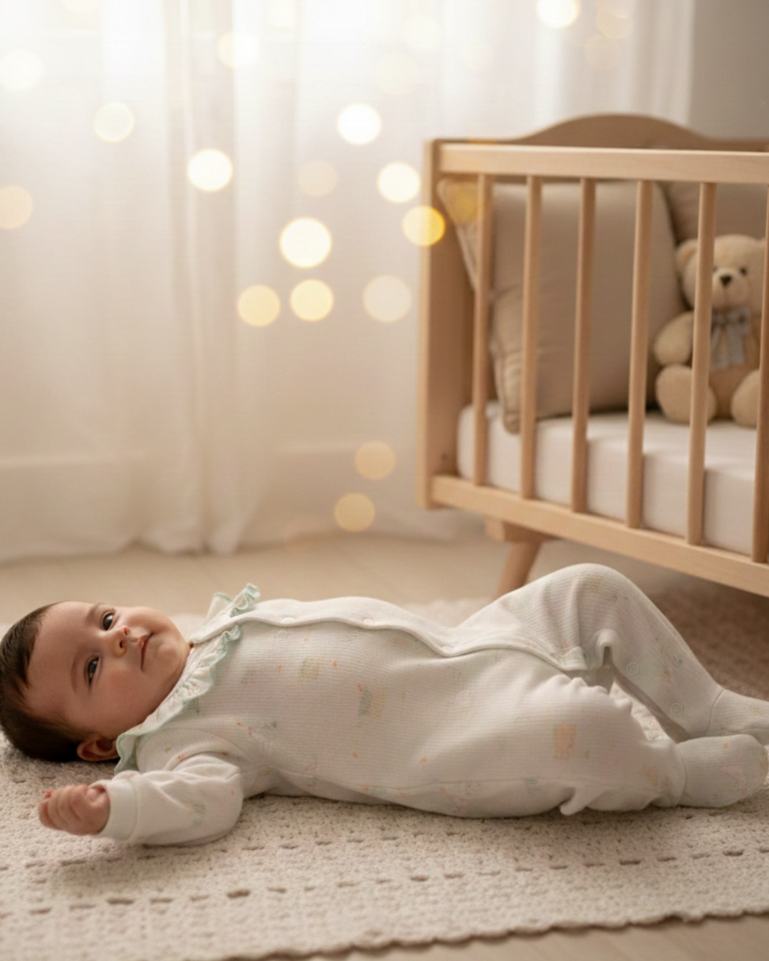 Macacão bebê feminino longo, confeccionado em malha ribana canelada estampada (66% poliéster, 32% viscose, 2% elastano). Possui abertura em botão de pressão e detalhe de babado, garantindo conforto e um toque delicado para o dia a dia da sua pequena.