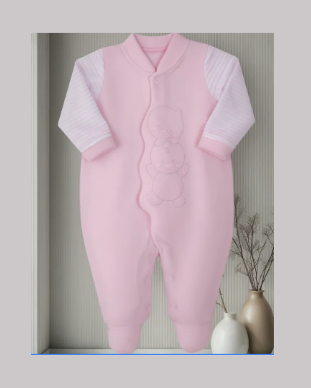 Macacão bebê longo em Microsoft PET Thermo, tecido macio e térmico para manter o bebê aquecido. Possui mangas em plush listrada, detalhe bordado delicado e abertura em botão de pressão, proporcionando praticidade na troca.