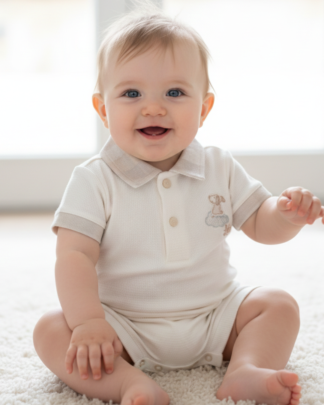 Macacão bebê masculino curto, confeccionado em meia malha leve (100% algodão), com detalhes de estampa xadrez, gola, bordado “Dog” e abertura por botão de pressão. Proporciona conforto e estilo para o dia a dia do bebê.