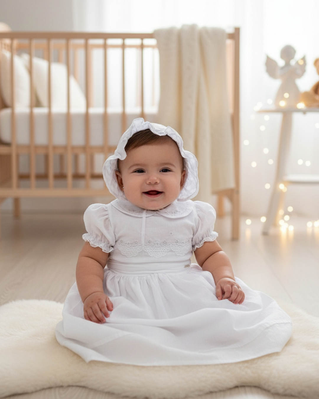 Confeccionado em cambraia 100% algodão, o modelo combina macacão com abertura em botão de pressão, saia com cós de elástico e chapéu delicado para compor o visual completo. O bordado suave e os acabamentos refinados tornam o conjunto ainda mais especial, unindo beleza, conforto e tradição.