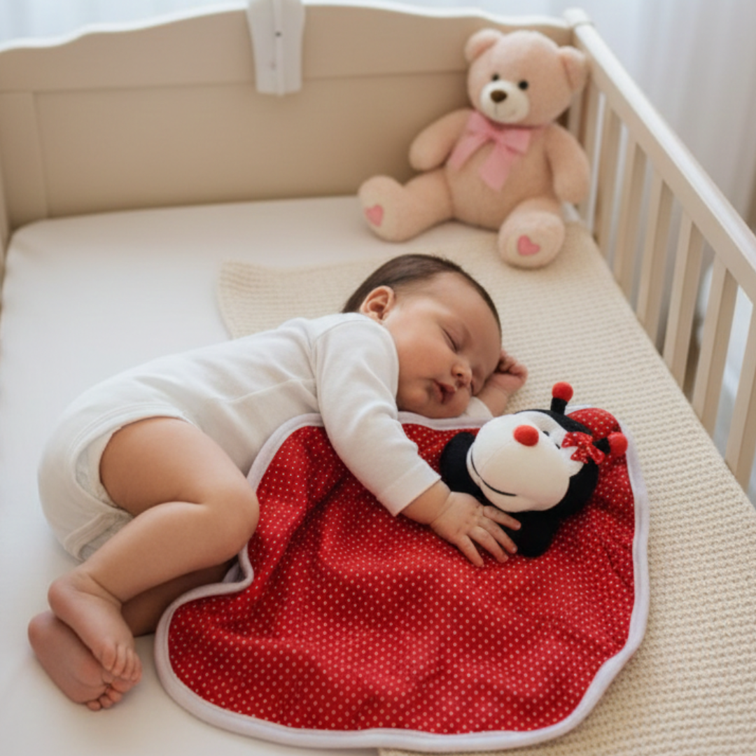 Com tamanho de 30 x 30 cm, é leve, portátil e perfeita para acompanhamento no soninho, no carrinho ou para confortar o bebê em qualquer momento.