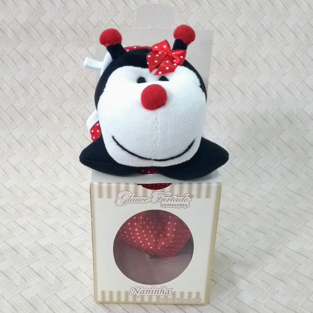 Naninha em malha forrado com malha com acabamento em vies. Com chocalho, bichinho e prendedor para chupeta.
