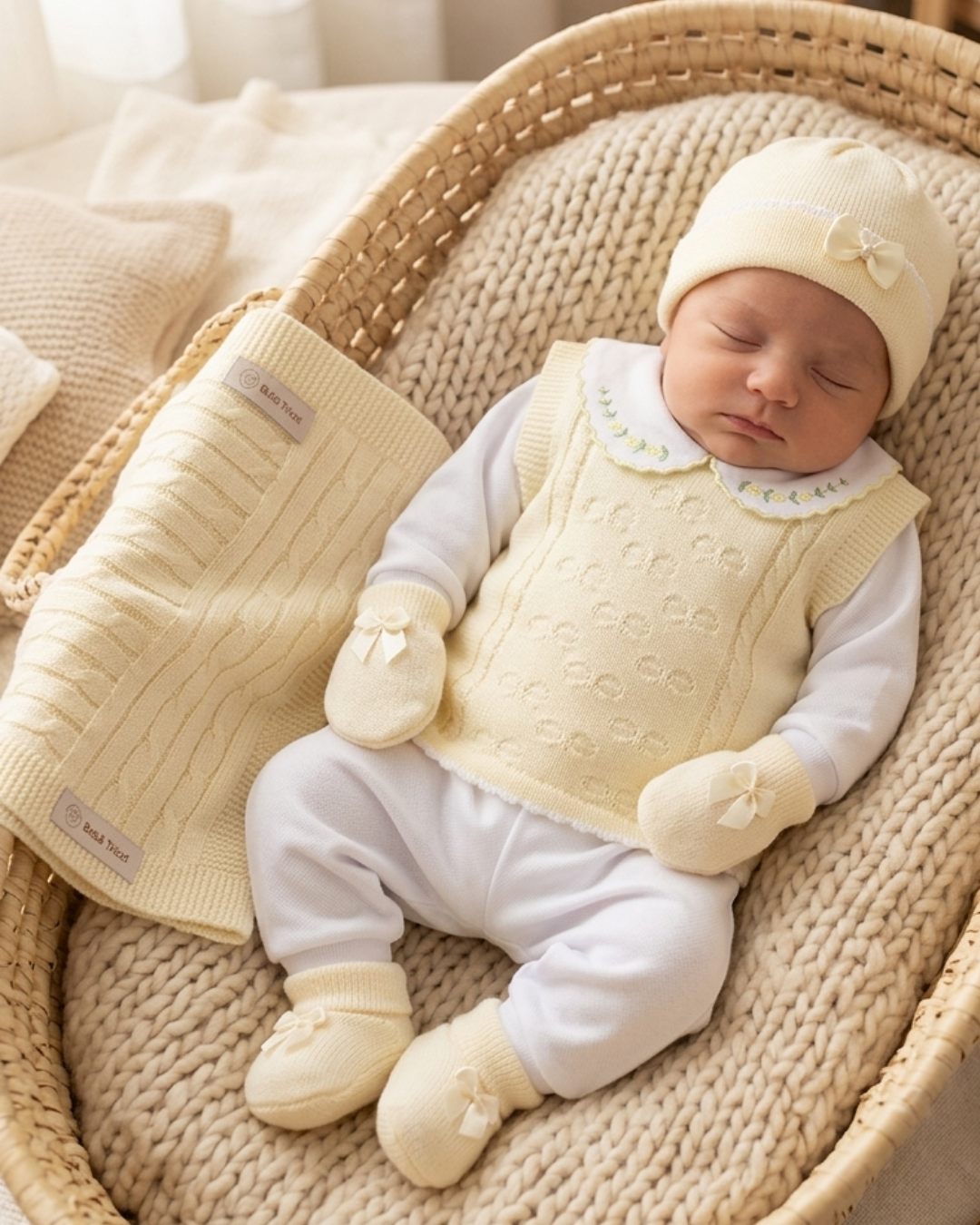 Conjunto Completo de Maternidade: Composto por 7 peças coordenadas em tricô de toque macio, unindo o estilo clássico à praticidade necessária para o recém-nascido.