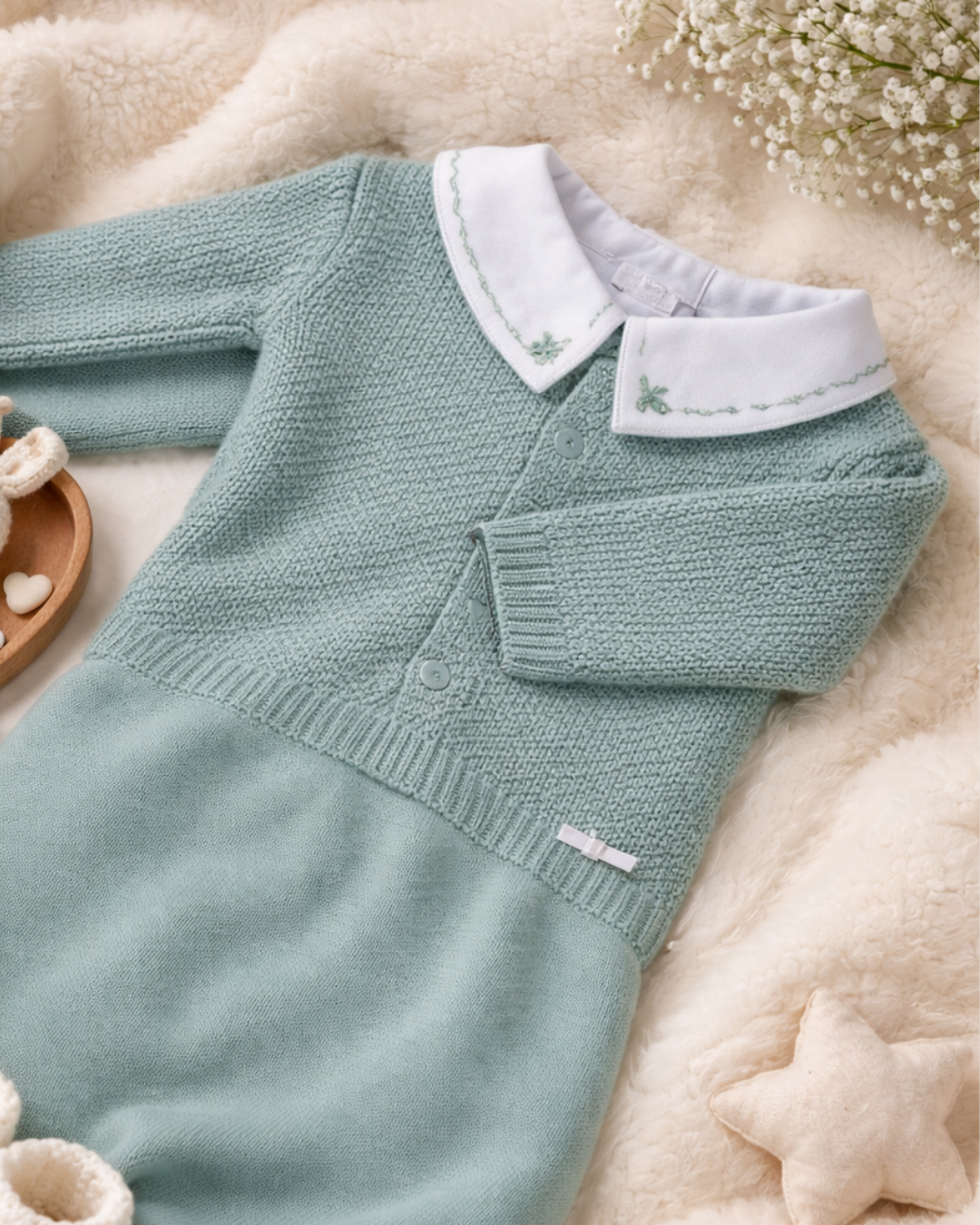 Conjunto Completo de Luxo: Composto por 6 peças coordenadas em tricô de alta qualidade, oferecendo um visual clássico e sofisticado para a primeira saída do bebê.