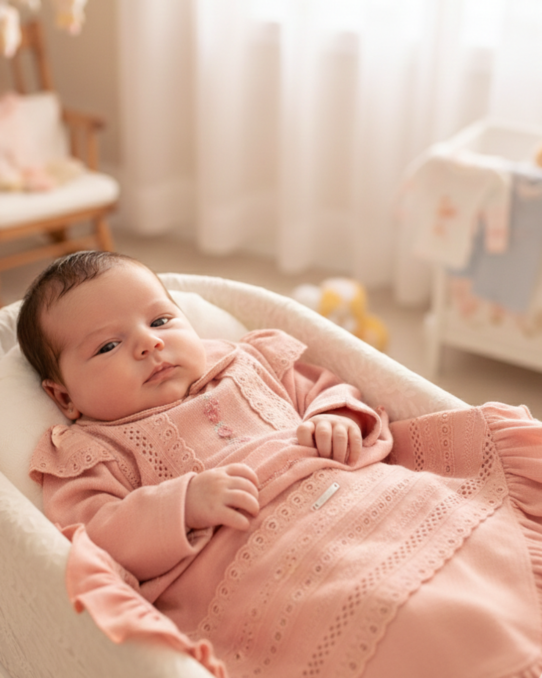 Acompanha manta coordenada com contorno em babado e plaquinha personalizada da marca, agregando sofisticação e delicadeza. Um conjunto perfeito para a chegada do bebê e outras ocasiões especiais.
