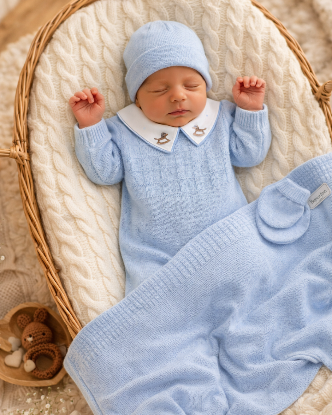 A Saída de Maternidade em Tricô Masculina da Bebê Tricot é ideal para os primeiros dias do bebê com conforto, estilo e muito charme. O conjunto é composto por 5 peças: macacão em tricot com detalhes delicados e acabamento refinado, body com gola bordada e abertura inferior por botão de pressão, touca aconchegante, par de luvas e manta em tricot. Prático e elegante, esse conjunto mantém o bebê aquecido nos momentos mais especiais. A manta mede 70cm x 80cm e não possui forro, sendo leve e confortável para o recém-nascido.