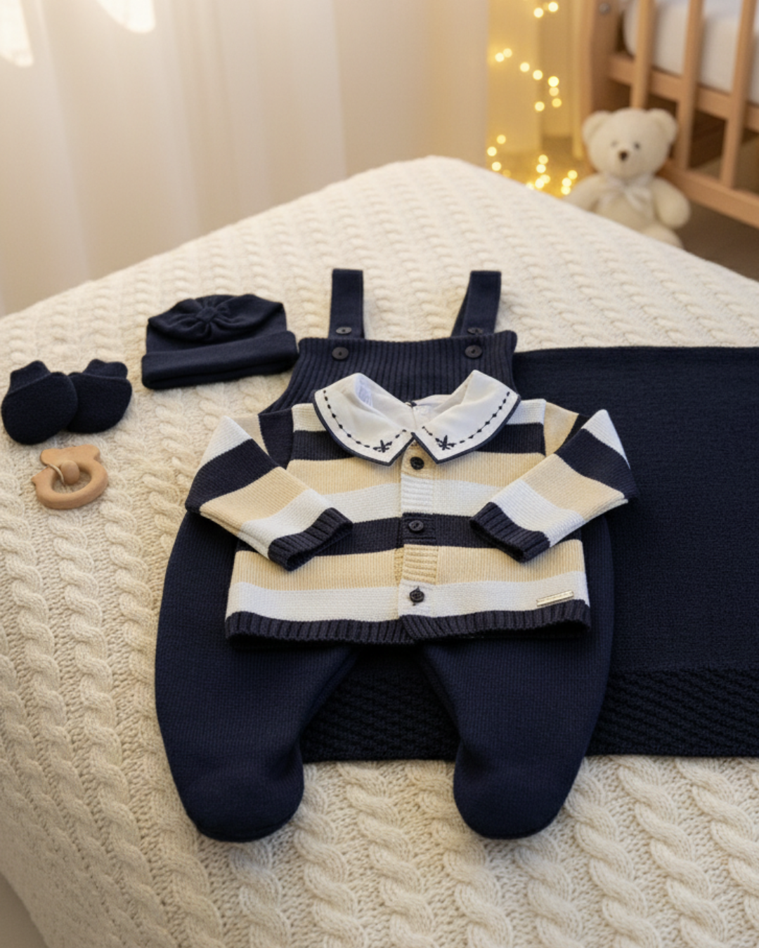 A Saída de Maternidade em Tricô Masculina da Bebê Tricot é ideal para os primeiros dias da bebê com muito estilo, aconchego e praticidade. Este conjunto encantador é composto por 6 peças: casaquinho em tricô com fechamento em botão, jardineira com abertura inferior por botão de pressão, body com gola bordada em algodão, touca, par de luvas e manta em tricô sem forro.