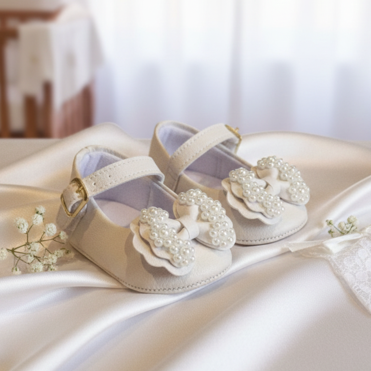 O destaque fica por conta do lindo laço duplo com aplicação de pérolas, que traz charme e elegância à peça. Possui fechamento em fivela ajustável, garantindo melhor ajuste e segurança durante o uso. O interior é acolchoado, proporcionando mais conforto ao caminhar ou engatinhar.
