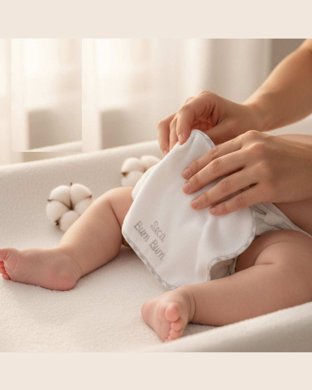 Feita em tecido fralda 100% algodão, é super macia, absorvente e segura para a pele sensível do bebê. Cada fraldinha vem com o bordado "Seca Bum Bum", agregando um charme especial ao cuidado diário.