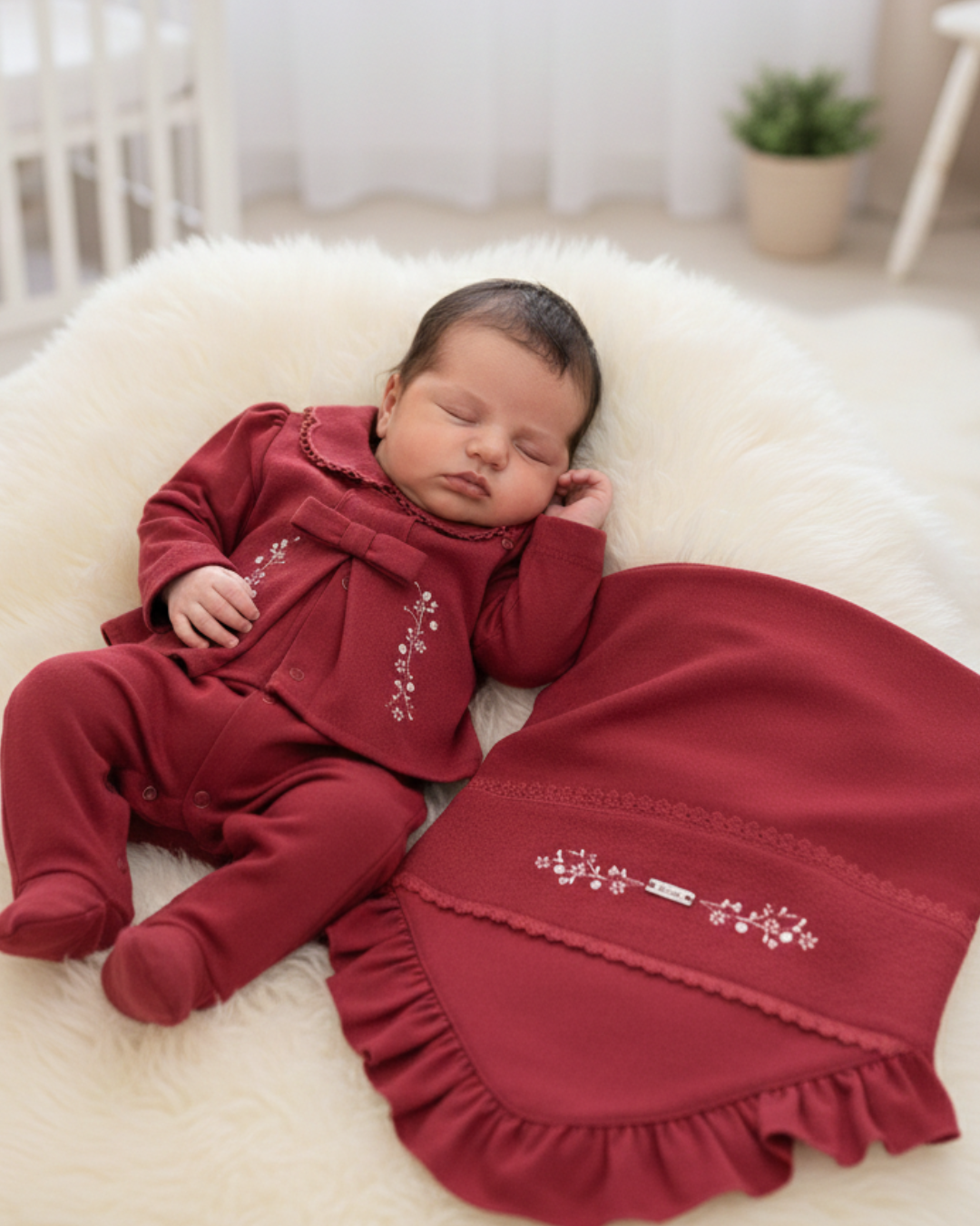 Acompanha manta bordada com contorno em babadinhos delicados e plaquinha personalizada da marca, garantindo sofisticação e um toque especial.