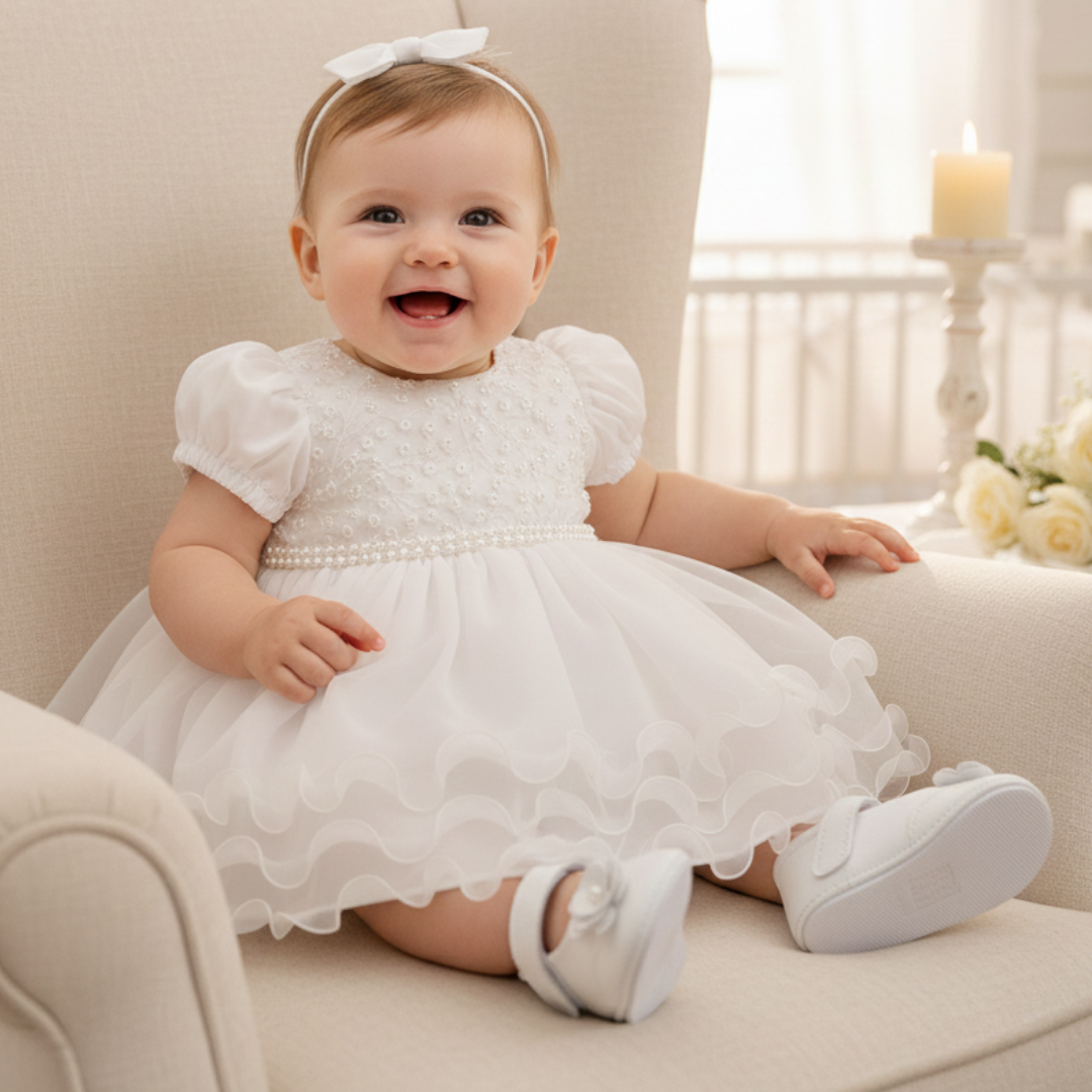 Visual Encantador: Um vestido clássico e sofisticado, desenvolvido especialmente para batizados e celebrações que pedem uma peça memorável e delicada.
