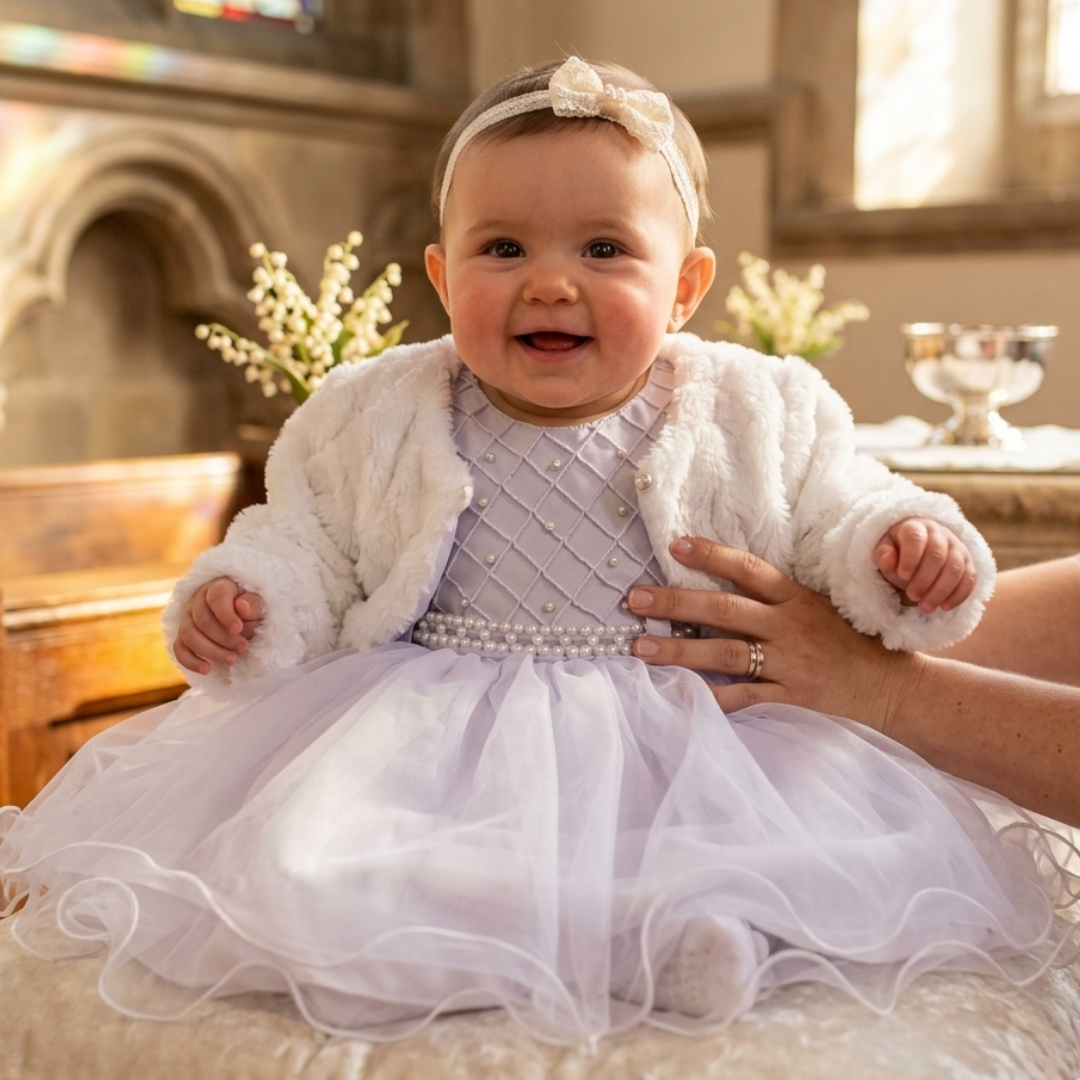Conjunto Luxuoso de Inverno: Um kit coordenado e angelical, composto por um vestido sofisticado e um bolero quentinho, desenvolvido especialmente para batizados e celebrações inesquecíveis em dias mais frios.