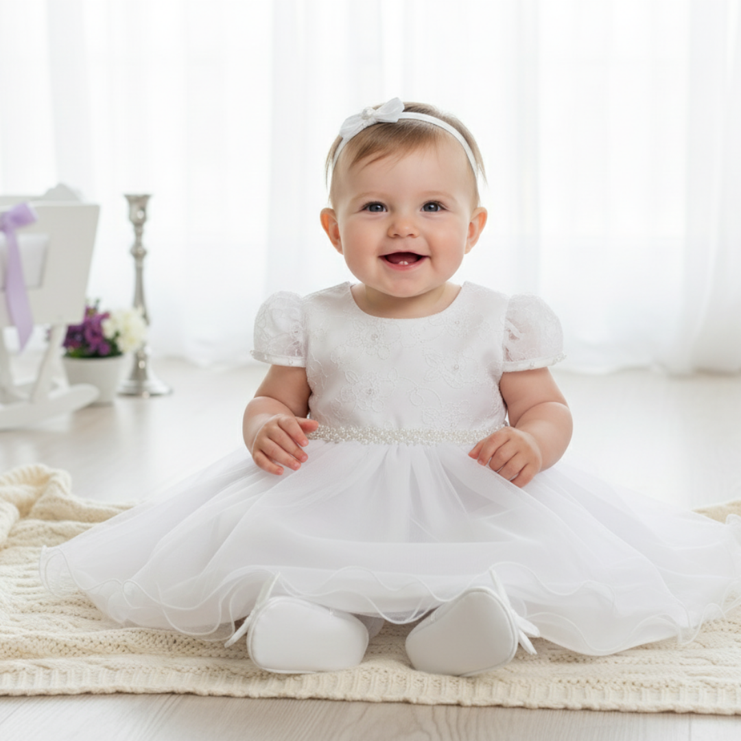 Confeccionado em um estilo clássico, a parte superior do vestido apresenta um delicado trabalhado em bordados, conferindo uma textura rica e um visual gracioso. Para garantir o ajuste perfeito e o máximo conforto, a parte superior das costas possui elástico, adaptando-se suavemente ao corpinho da bebê. A cintura é elegantemente adornada com uma faixa de pérolas, que adiciona um toque luxuoso e refinado.