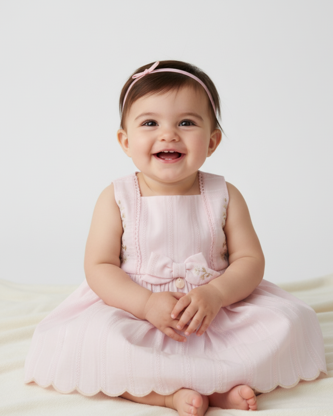 O vestido é confeccionado em tecido jacquard trabalhado, garantindo um caimento leve e confortável. Possui decote "V" nas costas e abertura em botão de pressão para facilitar o vestir. Os detalhes ricos em bordados no busto e o contorno em rendinhas na barra trazem um charme e delicadeza inigualáveis à peça. Um laço decorativo na cintura finaliza o visual com graciosidade.