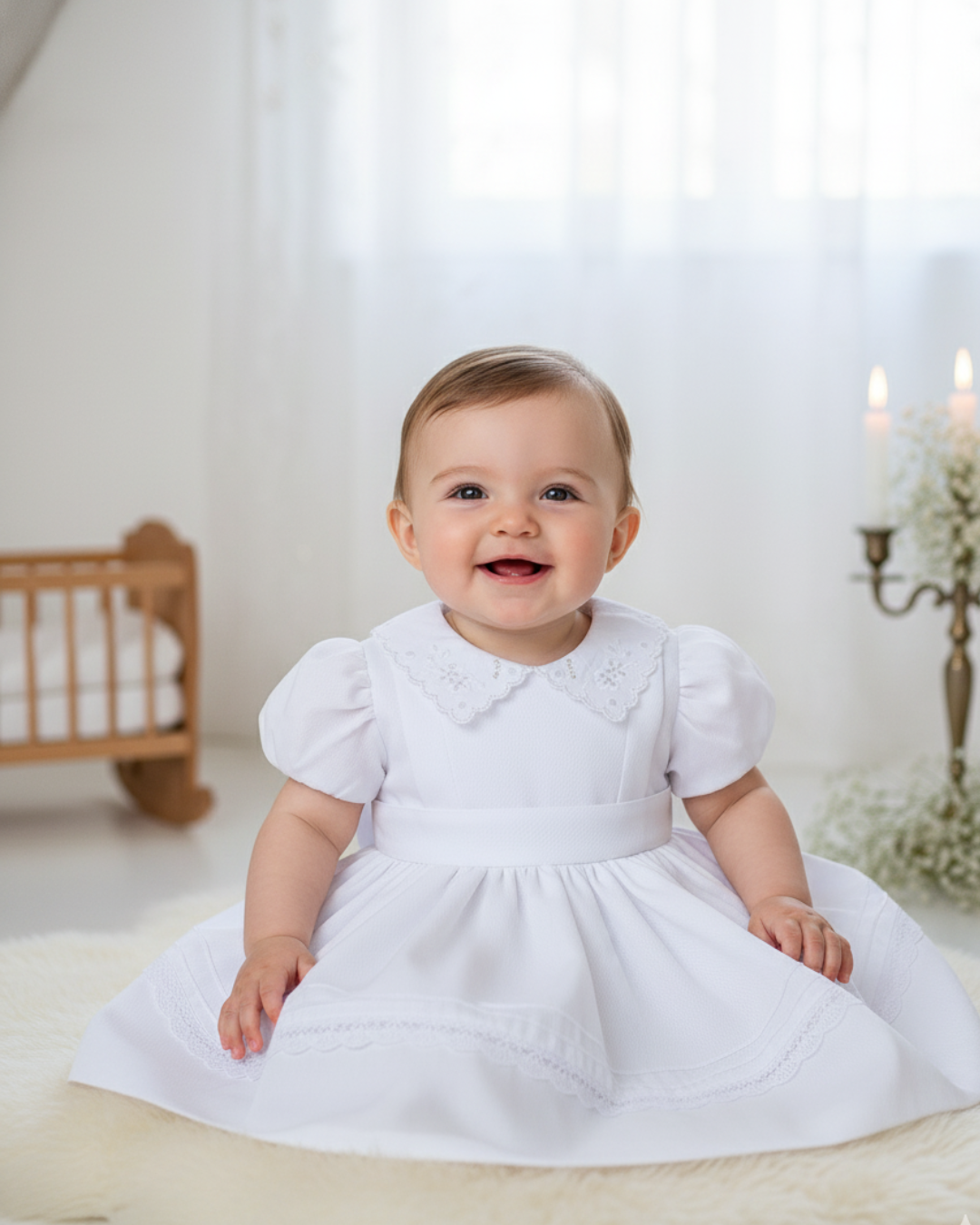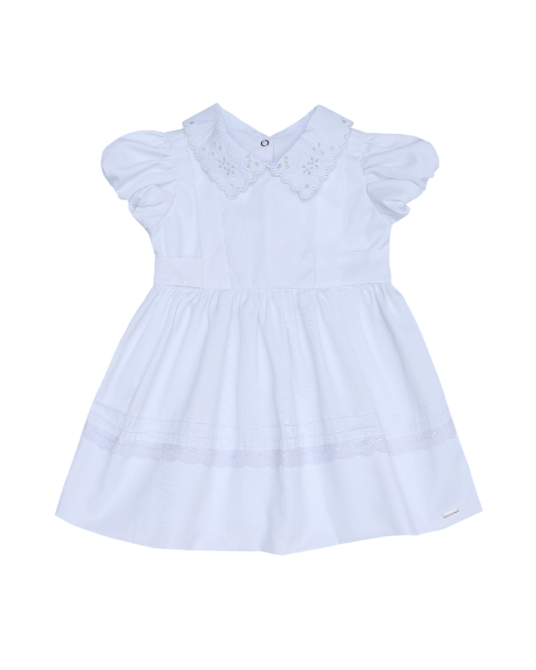 Vestido em tecido trabalhado, leve e confortável, com toque macio. Possui mangas balonê, gola bordada, abertura por botão de pressão nas costas, cinto embutido para dar laço e plaquinha personalizada da marca. Um look sofisticado e delicado, perfeito para ocasiões especiais.
